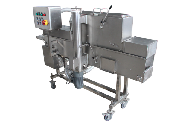 裹粉機能自動完成產品的上粉過程,適用于各種預上粉、混合粉等。產品進入下網(wǎng)帶,底部及側面沾滿粉,從上料斗流下的粉將產品上部覆蓋,經壓輥壓緊(上下網(wǎng)帶上的粉厚度可以方便調節(jié)),上粉后經過風管,將多余的粉吹落。進入下一道程序。