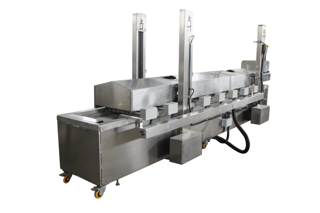 電油炸機是連續(xù)炸物機,食品從機體的進口端輸入后,隨輸送帶在熱油中通過時被油炸熟化,并從機體的出口端輸出。